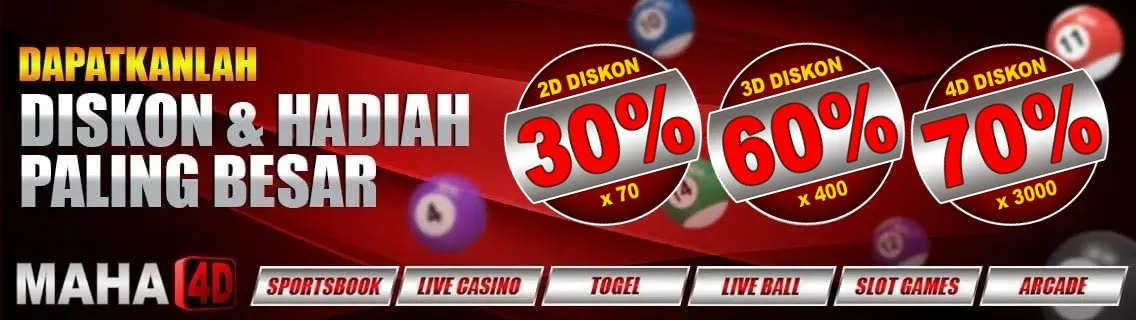 Maha4d menyediakan keuntungan khusus bagi setiap pemain dengan menberikan suatu diskon bettingan ataupun potongan harga saat melakukan taruhan angka. Berapa diskon yang diberikan oleh situs kami untuk semua pemain?. Diskon tersebut meliputi dari 4D 66%, 3D 59% dan 2D 29%. Diskon pemasangan angka tersebut merupakan salah satu diskon terbesar yang pernah ada di seluruh perjudian togel online. Semua pemain akan mendapatkan diskon ataupun potongan harga secara otomatis jika melakukan taruhan angka togel jenis 4D, 3D dan 2D.